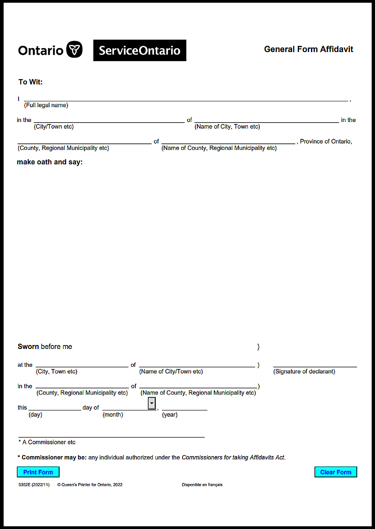 Below is a simple, ready-to-use Ontario affidavit form. You can copy and fill it.