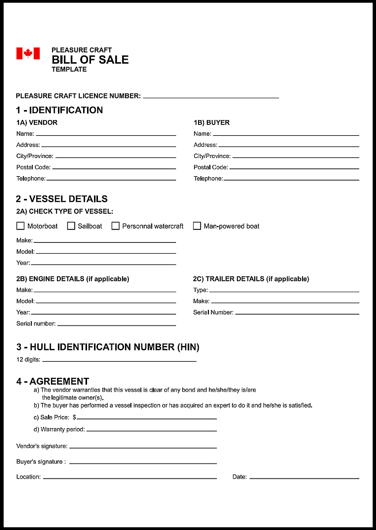 Note: Ontario does not provide an official boat bill of sale template. However, you can use the following pleasure craft bill of sale template for private sales. It includes all the required details such as buyer and seller information, vessel details, and signatures.