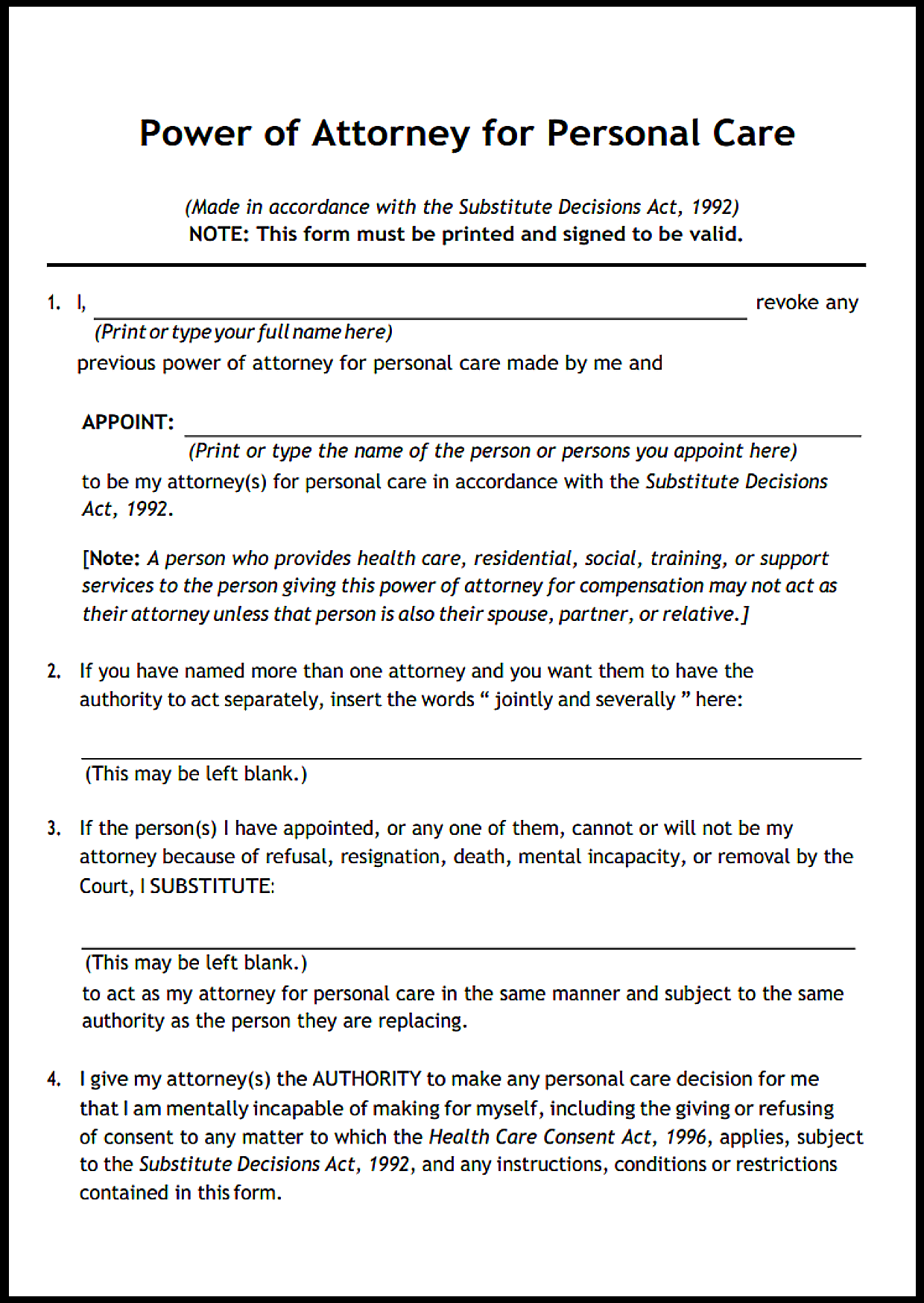 In Ontario, this document is legally known as a Power of Attorney for Personal Care under the Substitute Decisions Act. It allows a trusted person (called an attorney) to make healthcare decisions for you if you become mentally incapable.